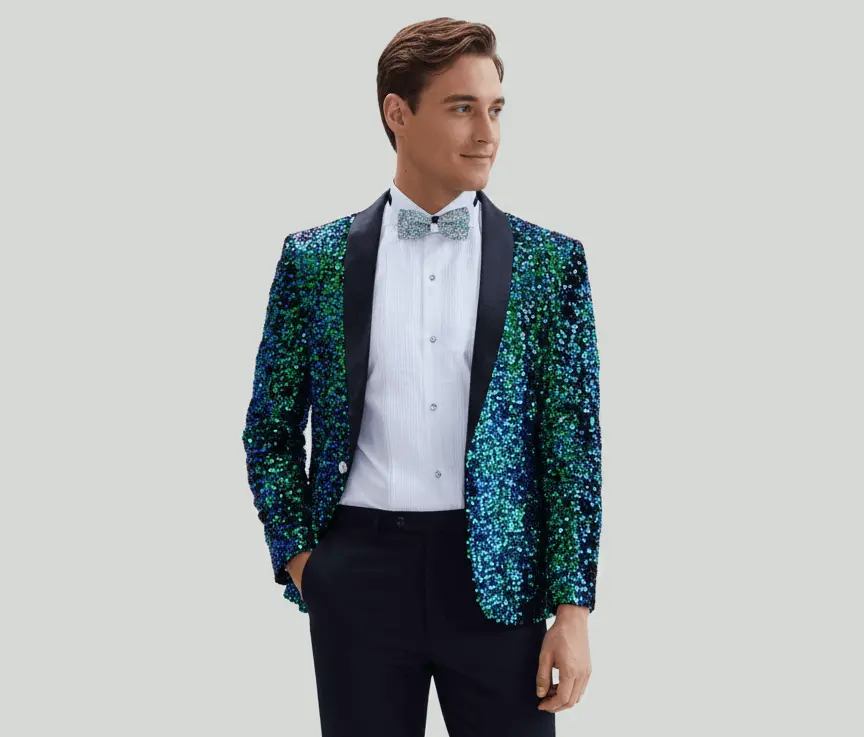 A shimmering blue-green sequin blazer styled with a crisp white shirt and a matching bow tie delivers a festive, high-energy Christmas look. Worn with simple black trousers, the jacket becomes the statement piece—ideal for evening celebrations, themed events, or end-of-year parties.